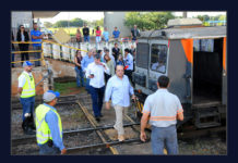 Governador e comitiva do governo federal realizam inspeção na via férrea DF-Valparaíso (GO). Trecho será o primeiro a transportar passageiros com ajuda de trens